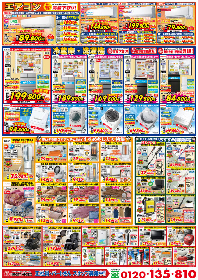チラシ裏面は、大人気のエアコン!お部屋全体の暖かさを保つにはやっぱりエアコンです。