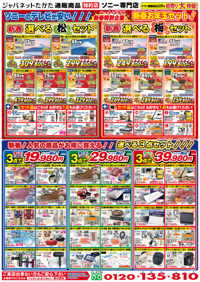 チラシ掲載商品のソニーテレビをご購入すると新春お年玉セットとして選べる「松セット」、「梅セット」をご準備いたしました。
